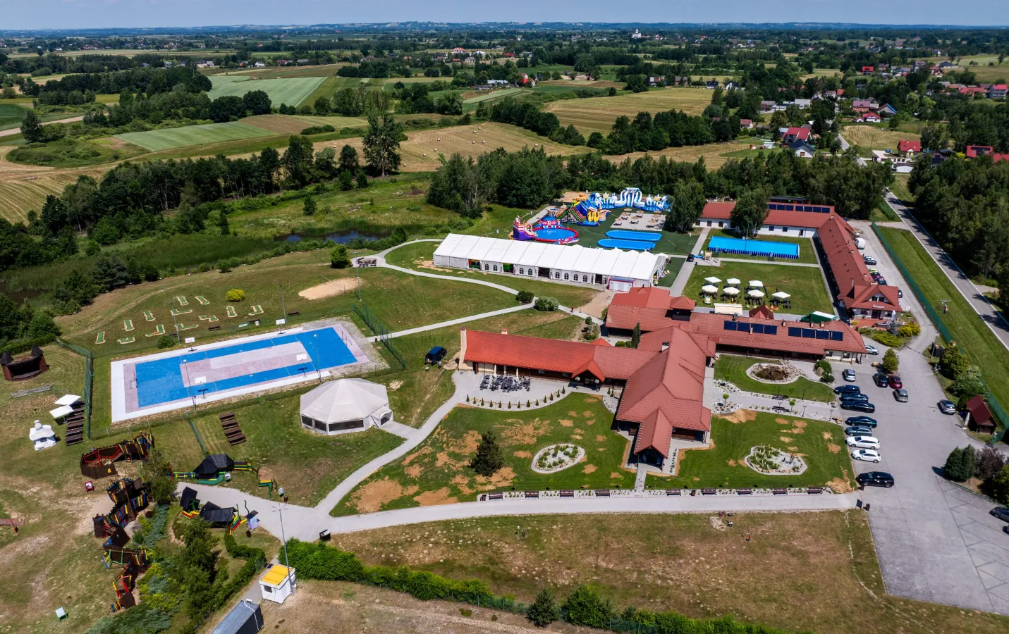 Kompleks rekreacyjny z aquaparkiem, parkiem linowym, torem gokartowym, mini zoo i tematycznym placem zabaw.