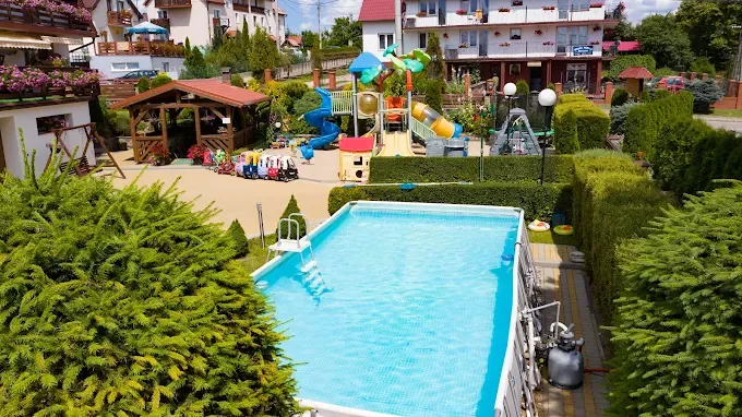 Na terenie obiektu znajduje się odkryty basen, idealny do letniego orzeźwienia, a także ogród z miejscem na grilla i plac zabaw, zapewniający rozrywkę dla najmłodszych. Dostępny jest również parking i bezprzewodowy internet. Miejsce to jest często wybierane przez rodziny szukające komfortowego wypoczynku na Mazurach.