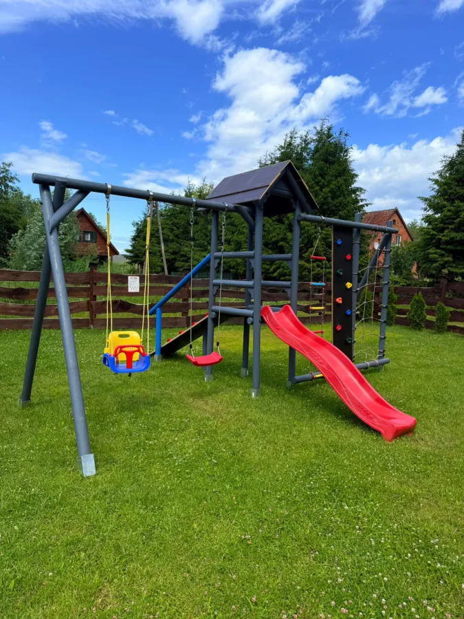 Trzy urocze, całoroczne domki drewniane na Mazurach w Wierzbie, z placem zabaw dla dzieci i dostępem do jezior.