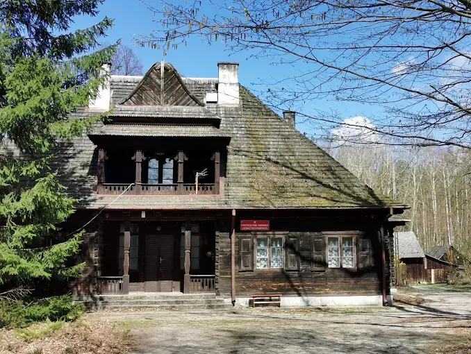 Skansen prezentujący drewniane budownictwo ludowe Puszczy Kampinoskiej, z zagrodami, ścieżkami edukacyjnymi i placem zabaw.