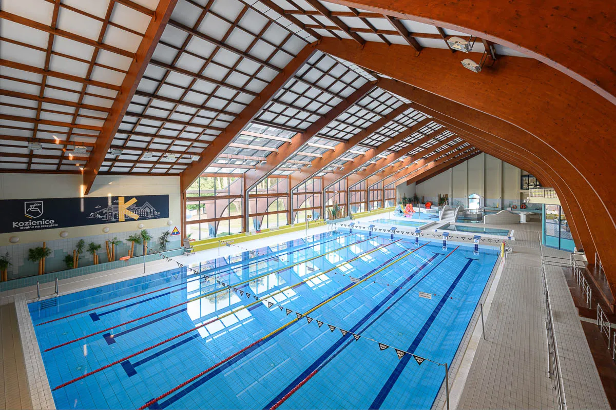 Kryta pływalnia Delfin w Kozienicach oferuje baseny sportowy i rekreacyjny, brodzik dla dzieci oraz zjeżdżalnie wodne.