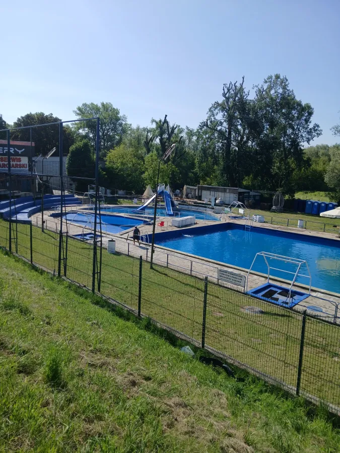 Sezonowy kompleks basenów odkrytych w Warszawie z brodzikiem dla dzieci, zjeżdżalnią, placem zabaw i boiskami.