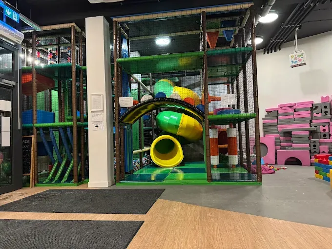 Kreatywna sala zabaw z małpim gajem, huśtawkami i dużymi klockami, oferująca zajęcia dla dzieci w każdym wieku.