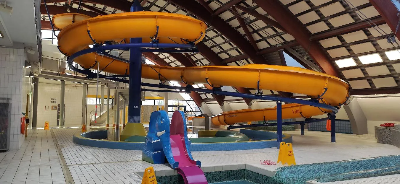 Kryta pływalnia z basenem sportowym i rekreacyjnym, zjeżdżalnią, sztuczną rzeką, brodzikiem dla dzieci oraz sauną i grotą solną.