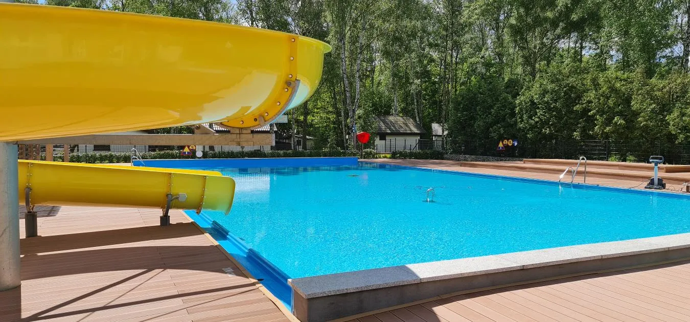 Letnia pływalnia z basenem rekreacyjnym, zjeżdżalnią, brodzikiem i wodnym placem zabaw dla dzieci w Parku Kultury w Powsinie.
