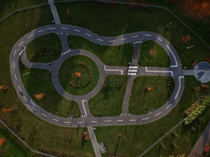 Publiczne miasteczko ruchu drogowego na Ursynowie do nauki zasad bezpieczeństwa i doskonalenia jazdy na rowerze dla dzieci i młodzieży.
