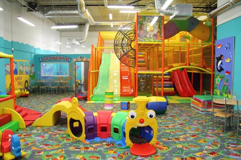 Kryta sala zabaw z konstrukcjami, zjeżdżalniami i basenami z piłeczkami, przeznaczona głównie na przyjęcia urodzinowe.