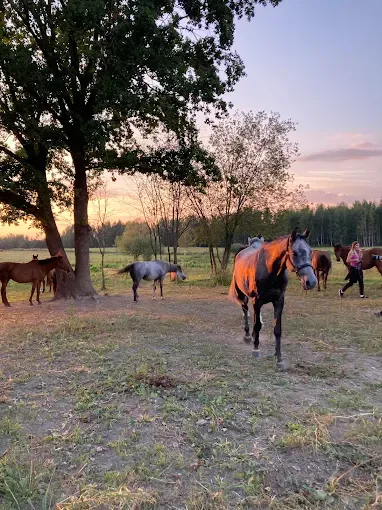 Stajnia oferująca naukę jazdy konnej oraz opiekę nad różnymi zwierzętami, takimi jak kozy, baranki, osiołek, psy, koty i szop.