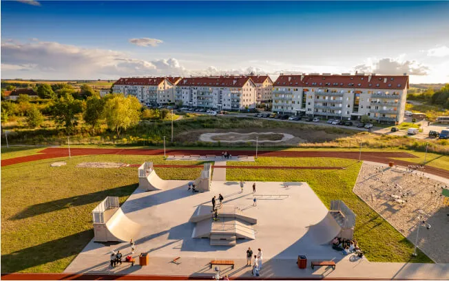Publiczny skatepark w Barczewie, oferujący przestrzeń do jazdy na deskorolce, rolkach i hulajnodze, często w sąsiedztwie pumptracka.