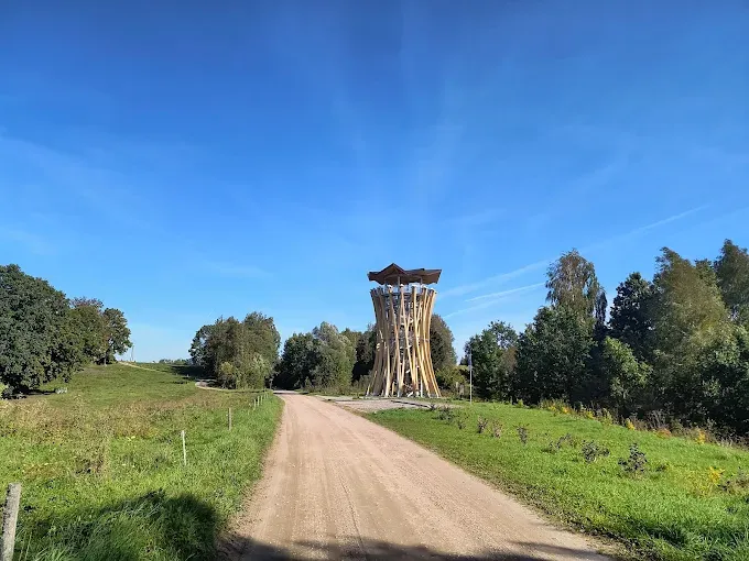 20-metrowa drewniano-stalowa wieża widokowa w Pobłędziu, oferująca panoramiczne widoki na jezioro i Puszczę Romincką.