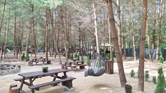 Naturalny park leśny z placem zabaw, strefą edukacyjną i rekreacyjną, oferujący aktywny wypoczynek dla dzieci i dorosłych.