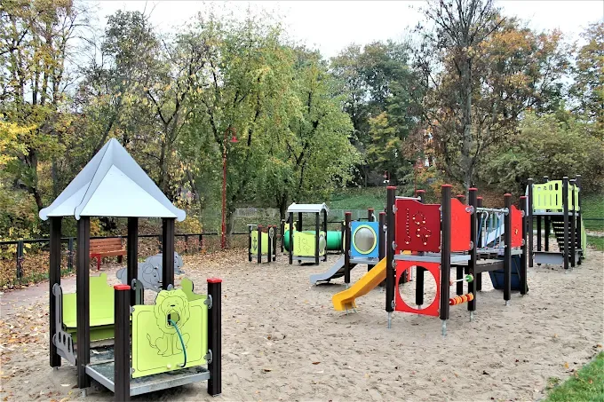 Malowniczy park miejski w Elblągu z nowoczesnym placem zabaw, alejkami spacerowymi i terenami rekreacyjnymi dla rodzin.