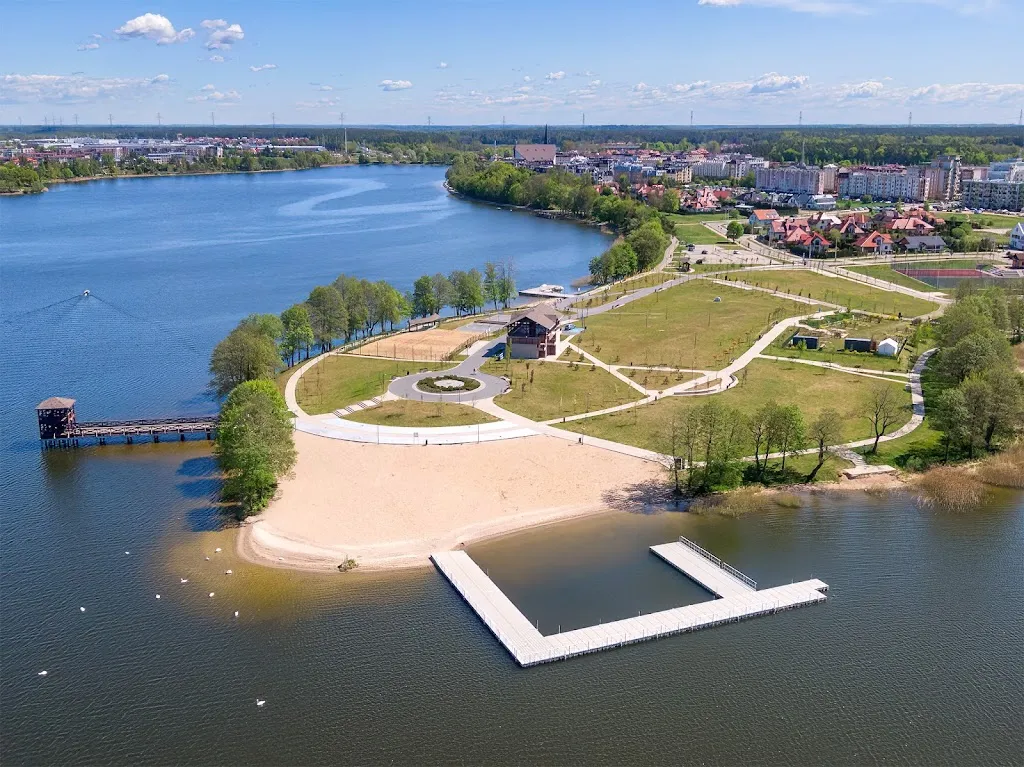Nowoczesna Plaża Miejska w Ełku z kąpieliskiem, boiskami sportowymi, placem zabaw i infrastrukturą rekreacyjną nad Jeziorem Ełckim.