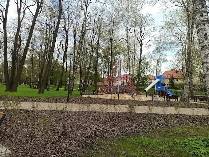 Nowoczesny park miejski w Giżycku z wodnym placem zabaw, linarium, tradycyjnym placem zabaw i plenerową siłownią.