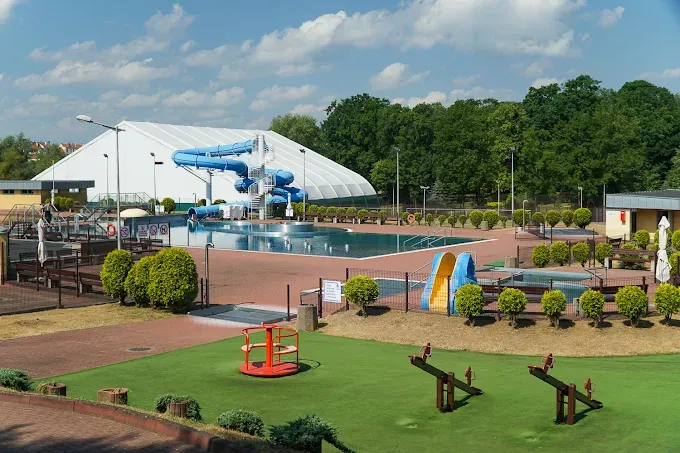 Odkryty basen miejski w Kętrzynie, część kompleksu Kętrzynianka, oferujący basen sportowy, rekreacyjny ze zjeżdżalnią i atrakcjami wodnymi oraz brodzik dla dzieci.
