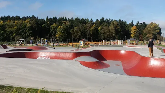 Nowoczesny skatepark w Kętrzynie na ulicy Poznańskiej, idealny do jazdy na rolkach, deskorolkach, hulajnogach i BMX-ach.