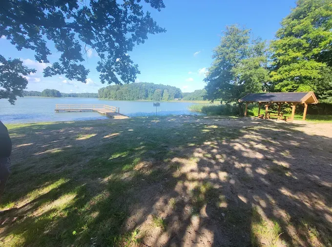 Piaszczysta plaża nad jeziorem Marąg z dostępem do molo, idealna do wypoczynku i aktywności wodnych.