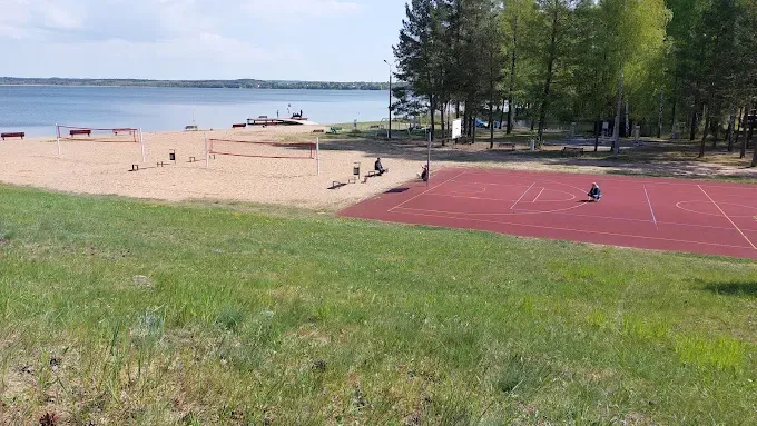 Piaszczysta plaża gminna w Kruklankach nad jeziorem Gołdapiwo z placem zabaw, boiskami sportowymi i wypożyczalnią sprzętu wodnego.
