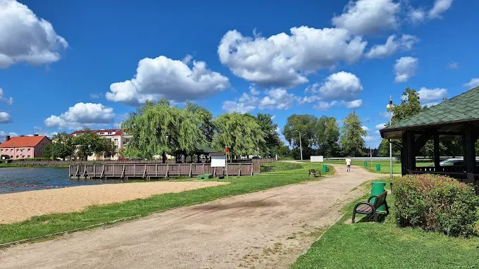 Malownicze jeziorko miejskie w Nidzicy z alejkami spacerowymi, molo i plażą, idealne do rekreacji i wypoczynku na świeżym powietrzu.