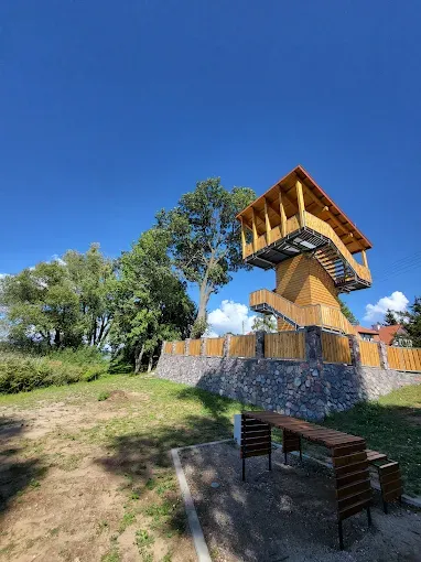 Wieża widokowa oferująca panoramiczne widoki na jezioro Śniardwy i okolicę, idealna na postój podczas wycieczek rowerowych.