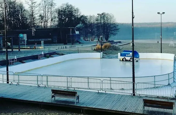 Sezonowe lodowisko na świeżym powietrzu, położone nad jeziorem Ukiel, oferujące jazdę na łyżwach dla rodzin i wypożyczalnię.