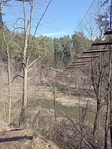 Park linowy w Olsztynie oferujący różnorodne trasy przeszkód, zjazdy tyrolskie i mosty linowe, przeznaczony dla rodzin z dziećmi i dorosłych.