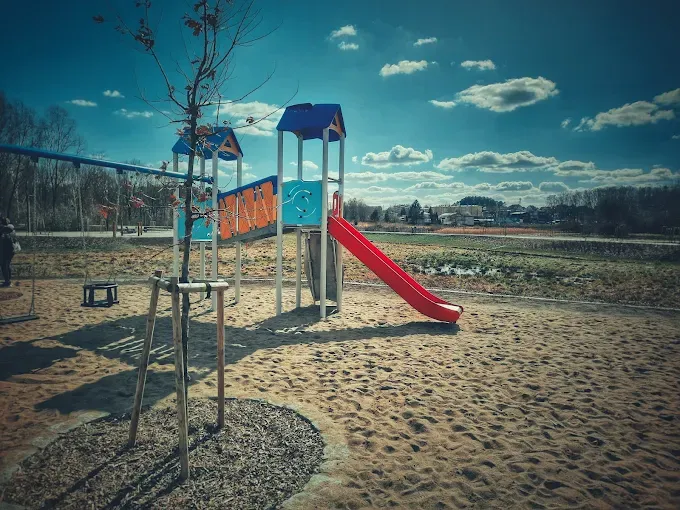 Miejski park rekreacyjny w Olsztynie z placami zabaw, trampolinami, ścieżkami pieszo-rowerowymi i torem Ninja Warrior dla rodzin.