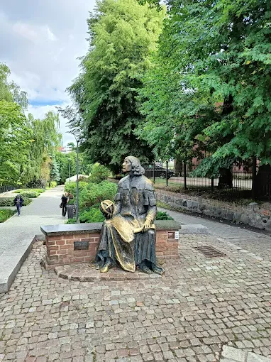 Duży park miejski w Olsztynie z alejkami spacerowymi, ścieżkami rowerowymi, fontannami, rzeźbami i placem zabaw dla dzieci.