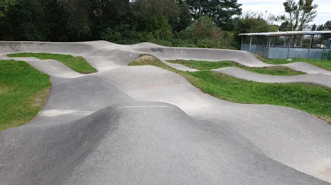 Asfaltowy tor pumptrack z muldami i zakrętami w Olsztynie, idealny do jazdy na rowerze, hulajnodze, rolkach czy deskorolce bez pedałowania.