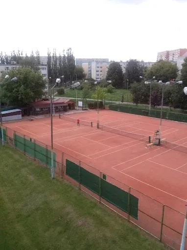 Kompleks kortów tenisowych w Olsztynie oferujący naukę, wynajem i turnieje, w tym szkółkę dla dzieci.