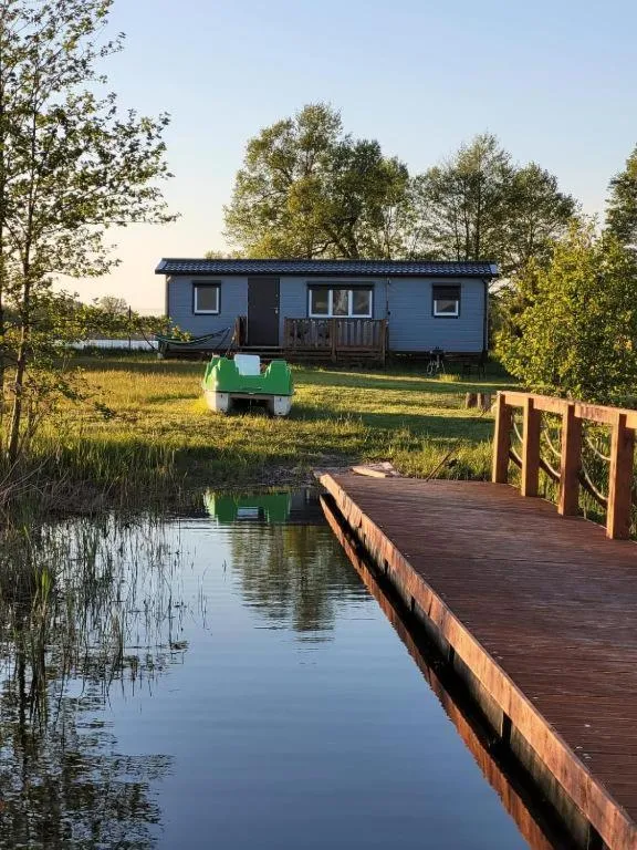 Komfortowe domki letniskowe nad jeziorem Szóstak z prywatną plażą, placem zabaw dla dzieci i sprzętem wodnym.