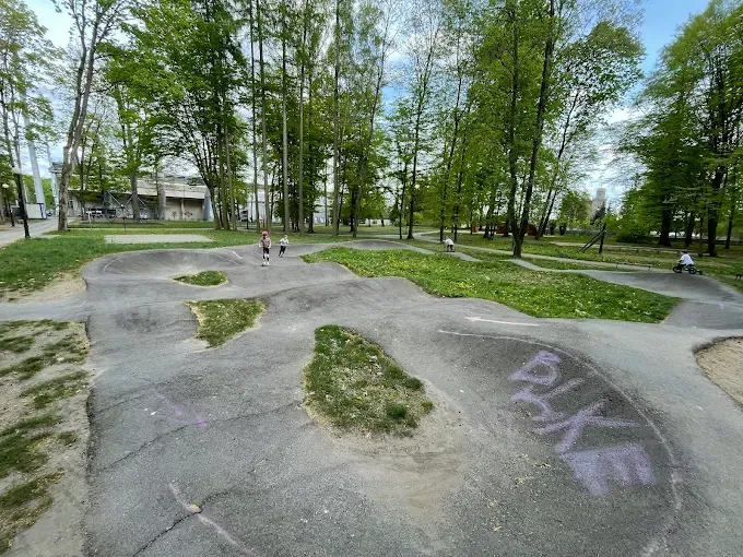 Asfaltowy tor rowerowy pumptrack w Parku Collisa w Ostródzie, z pętlami dla dorosłych i mniejszym torem dla dzieci, dostępny bezpłatnie.