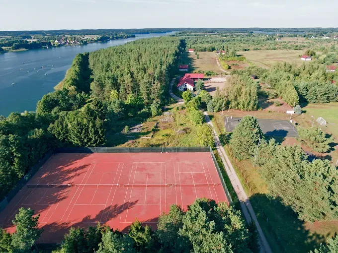 Korty tenisowe zlokalizowane na terenie Ośrodka Wypoczynkowego Kalwa, oferującego również boiska sportowe, plac zabaw i plażę nad jeziorem.