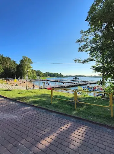 Piaszczysta plaża nad jeziorem Narie z wydzielonym kąpieliskiem, pomostem, placem zabaw i wypożyczalnią sprzętu wodnego.