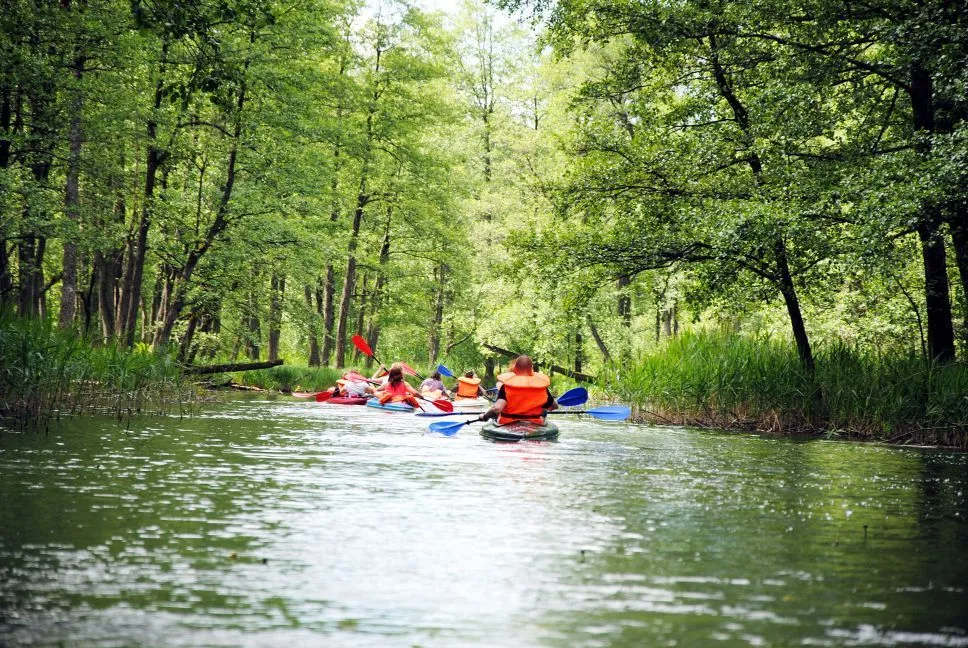 Spływy kajakowe rzeką Sapiną na Mazurach, idealne dla rodzin z dziećmi. Oferta obejmuje wynajem kajaków 2+1 i transport.