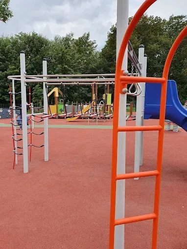 Park miejski w Reszlu oferujący plac zabaw, skate park, fontannę oraz tereny rekreacyjne dla rodzin i dzieci.