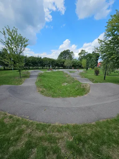 Asfaltowy tor rowerowy (pumptrack) w Rozogach, idealny do jazdy na rowerze, hulajnodze, rolkach i deskorolce.