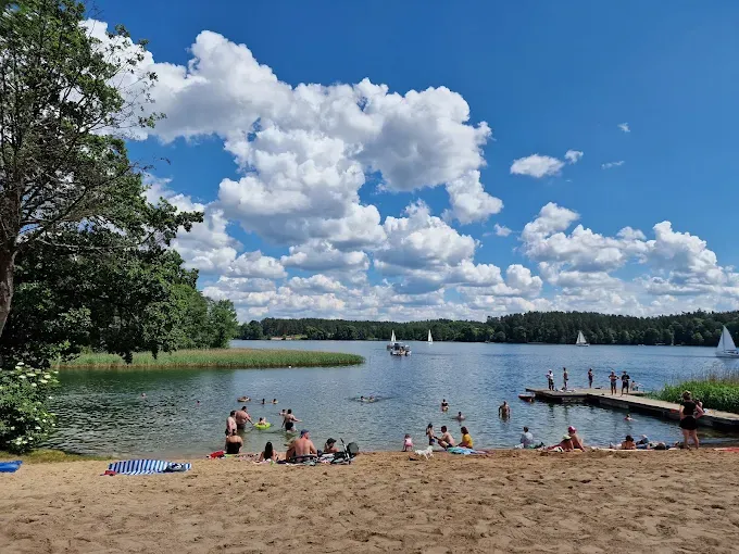 Plaża miejska nad jeziorem Nidzkim w Rucianem-Nidzie z piaszczystym brzegiem, idealna do kąpieli i zabaw wodnych dla rodzin.
