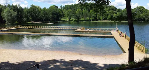 Piaszczysta plaża miejska nad Jeziorem Ołów w Rynie z kąpieliskiem strzeżonym, placem zabaw dla dzieci i wypożyczalnią sprzętu wodnego.
