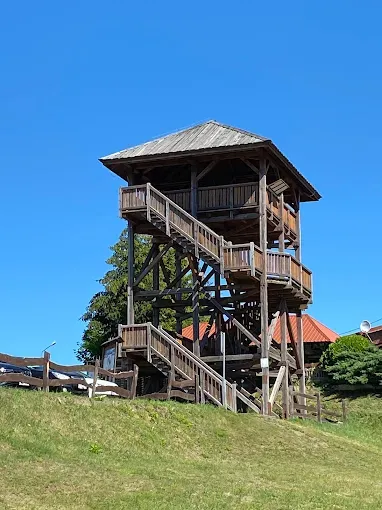 Drewniana wieża widokowa w Siemianach nad Jeziorem Jeziorak, oferująca panoramiczne widoki na okolicę i jezioro.