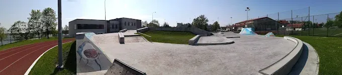 Nowoczesny skatepark w Suszu z elementami do jazdy na deskorolkach, rolkach i rowerach BMX, w tym bowl, murki i poręcze.