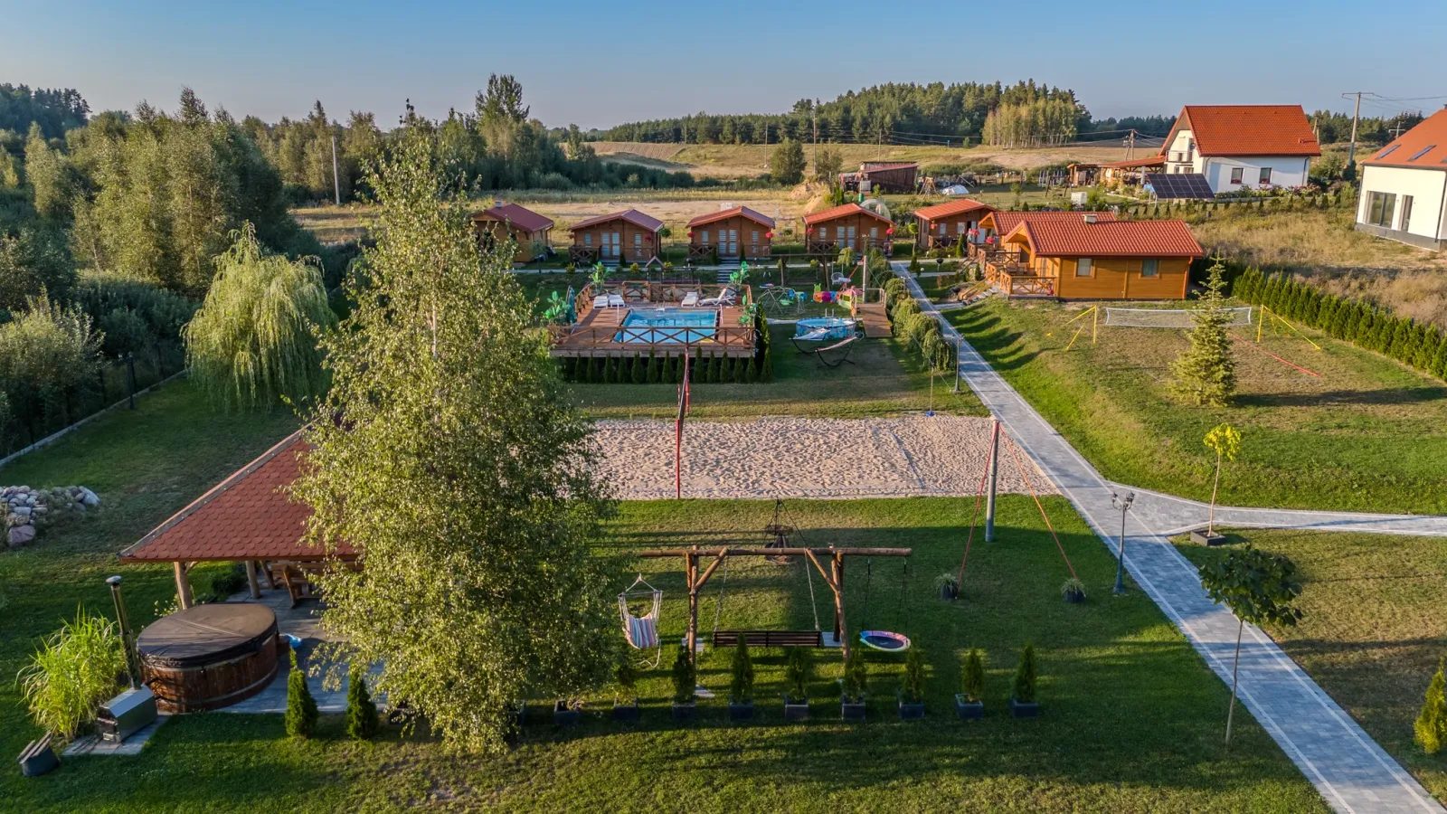 Kompleks 7 domków wypoczynkowych na Mazurach, w Zełwągach, z licznymi atrakcjami dla rodzin z dziećmi, takimi jak baseny, plac zabaw i boiska sportowe.